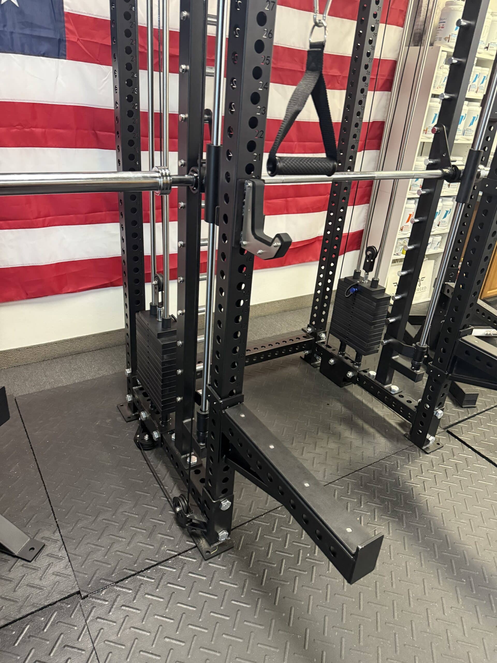 - Integrated Smith machine with a 45 lb bar